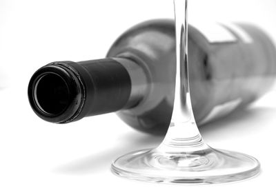 empty wine bottle laying on its side with bottom and stem of wine glass